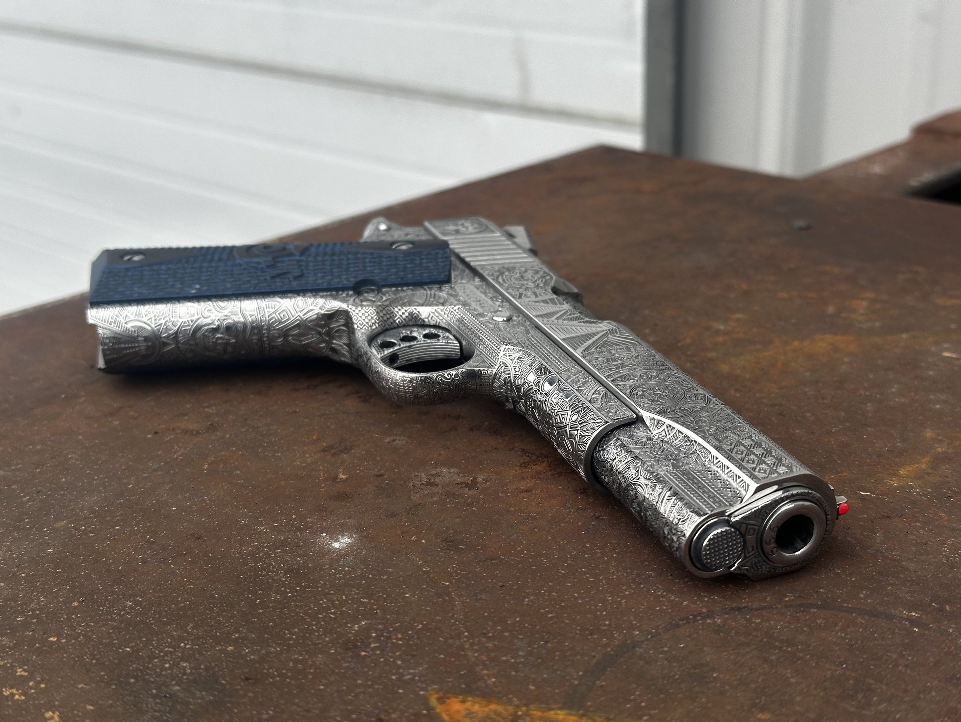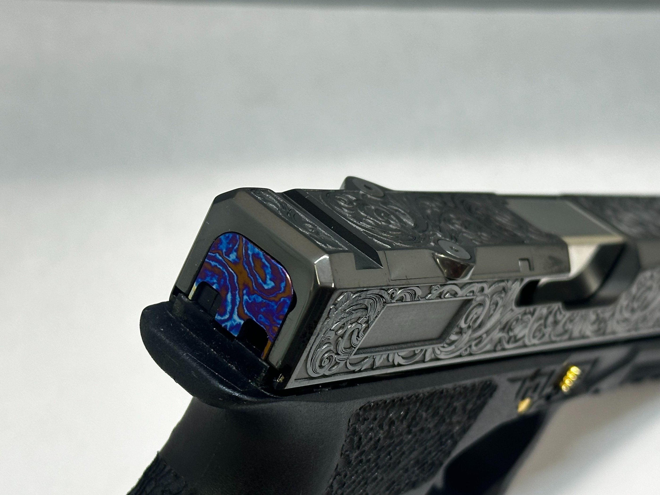 I am dropping a line to let you know that I am completely satisfied with both your design and workmanship tn the Slide and barrel you engraved for me. I could not ask for a better job even for twice the money. All I can say is, if you want engraving, its here. I will use this service again. WPresler